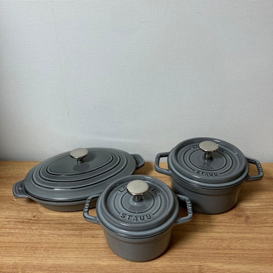 ストウブの小さなココット鍋2個セットです。12cmブラックグレーIHとトースターでたまに使用しておりました。他にもSTAUB鍋を出品中です。⭐︎プロフィールをお読みください、よろしくお願いいたします⭐︎- ブランド: STAUB- モデル名: LA COCOTTE- カラー: グレー- カラー: ブラック- 材質: 鋳鉄- サイズ: 小型ご覧いただきありがとうございます。
